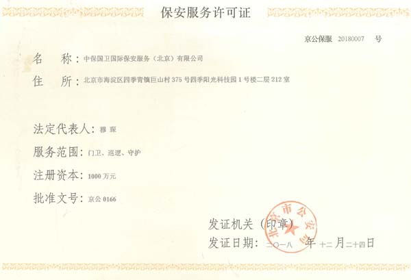 中保國衛(wèi)國際保安服務(北京)有限公司,屬中保國衛(wèi)集團旗下子公司。能全方位的為大型客戶提供優(yōu)質的安保、押運服務,是集人防和技防于一體的新型正規(guī)化綜合安保押運服務企業(yè),提供人防、物防、技防、聯(lián)網報*、非武裝押運等安防相關的一站式服務。